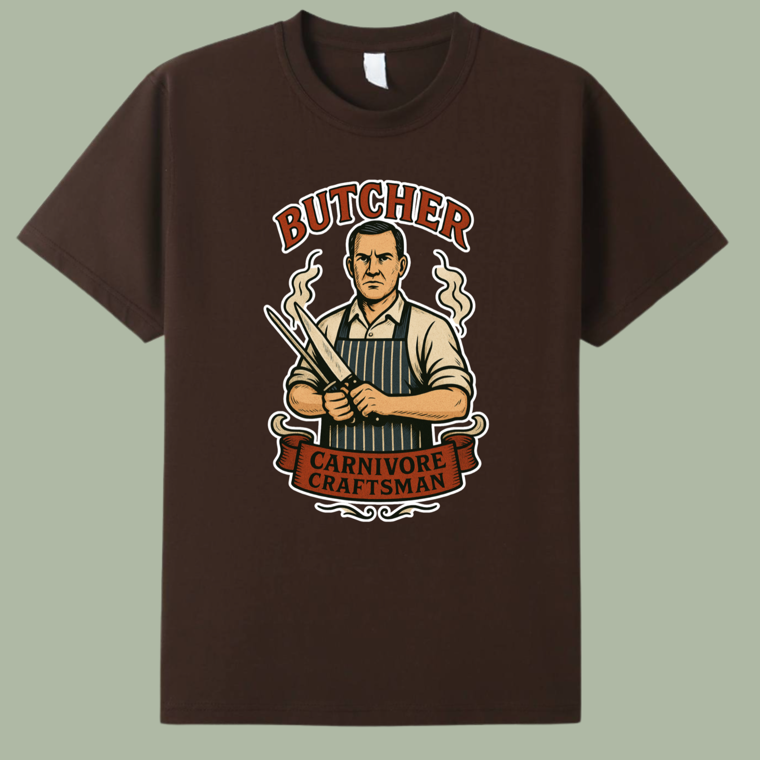 For the stoic craftsman who lets his cuts do the talking. This tee is a tribute to precision, grit, and the quiet pride of the butcher’s trade. Printed on rich brown cotton with a modern fit, it’s clean-cut, no-nonsense, and built for those who respect the blade and honour the beast.